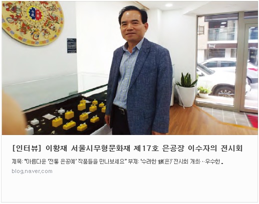 [인터뷰] 이황재 서울시무형문화재 제17호 은공장 이수자의 전시회 페이지 정보 작성자 서울무형유산교육전시장 작성일19-08-28 15:22 조회13,619회 댓글0건 관련링크 이전글 다음글 목록 본문 출처: 한국귀금속보석신문 네이버 블로그※ 기사 전문 게재는 저작권법 위반이기에 본문 내용은 하단 링크에서 확인 부탁드립니다.본문 보러가기: https://blog.naver.com/kpgnews/221625795267 댓글목록 등록된 댓글이 없습니다. 이전글 다음글 목록