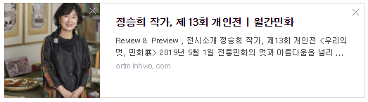 [월간민화] 정승희 작가, 제13회 개인전 <우리의 멋, 민화展> 페이지 정보 작성자 서울무형유산교육전시장 작성일19-06-08 10:42 조회13,350회 댓글0건 관련링크 이전글 다음글 목록 본문 정승희 작가, 제13회 개인전 <우리의 멋, 민화展> ▶ 기사 보러가기:https://bit.ly/2KBcoWa출처: 월간민화※ 기사 전문 게재는 저작권법 위반이기에 본문 내용은 링크에서 확인 부탁드립니다. 댓글목록 등록된 댓글이 없습니다. 이전글 다음글 목록