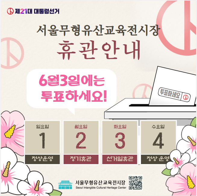 [서울무형유산교육전시장] 6월 3일 대통령 선거일 휴관공지 페이지 정보 작성자 서울무형유산교육전시장 작성일25-05-28 16:36 조회2,541회 댓글0건 관련링크 이전글 다음글 목록 본문 [서울무형유산교육전시장] 휴관안내서울무형유산교육전시장은 6월 3일(화) 대통령 선거일에 휴관이오니 일정에 참고 바랍니다! 댓글목록 등록된 댓글이 없습니다. 이전글 다음글 목록