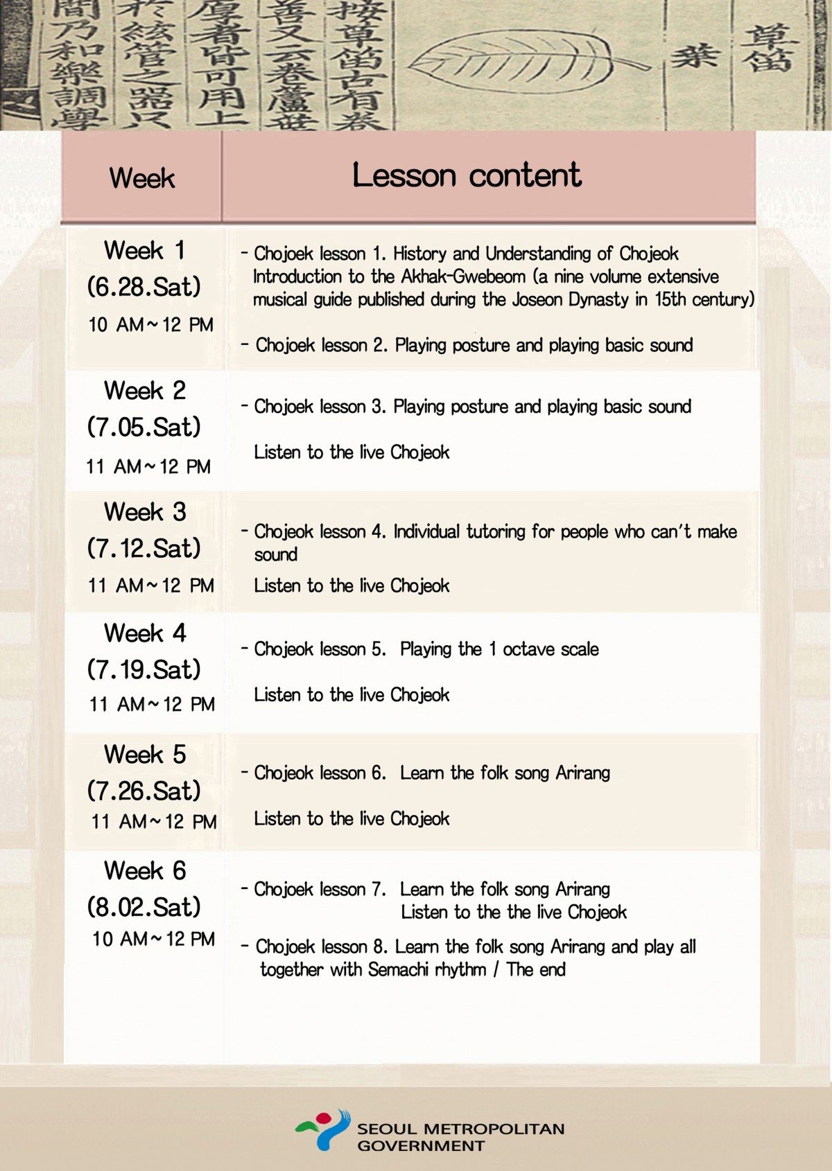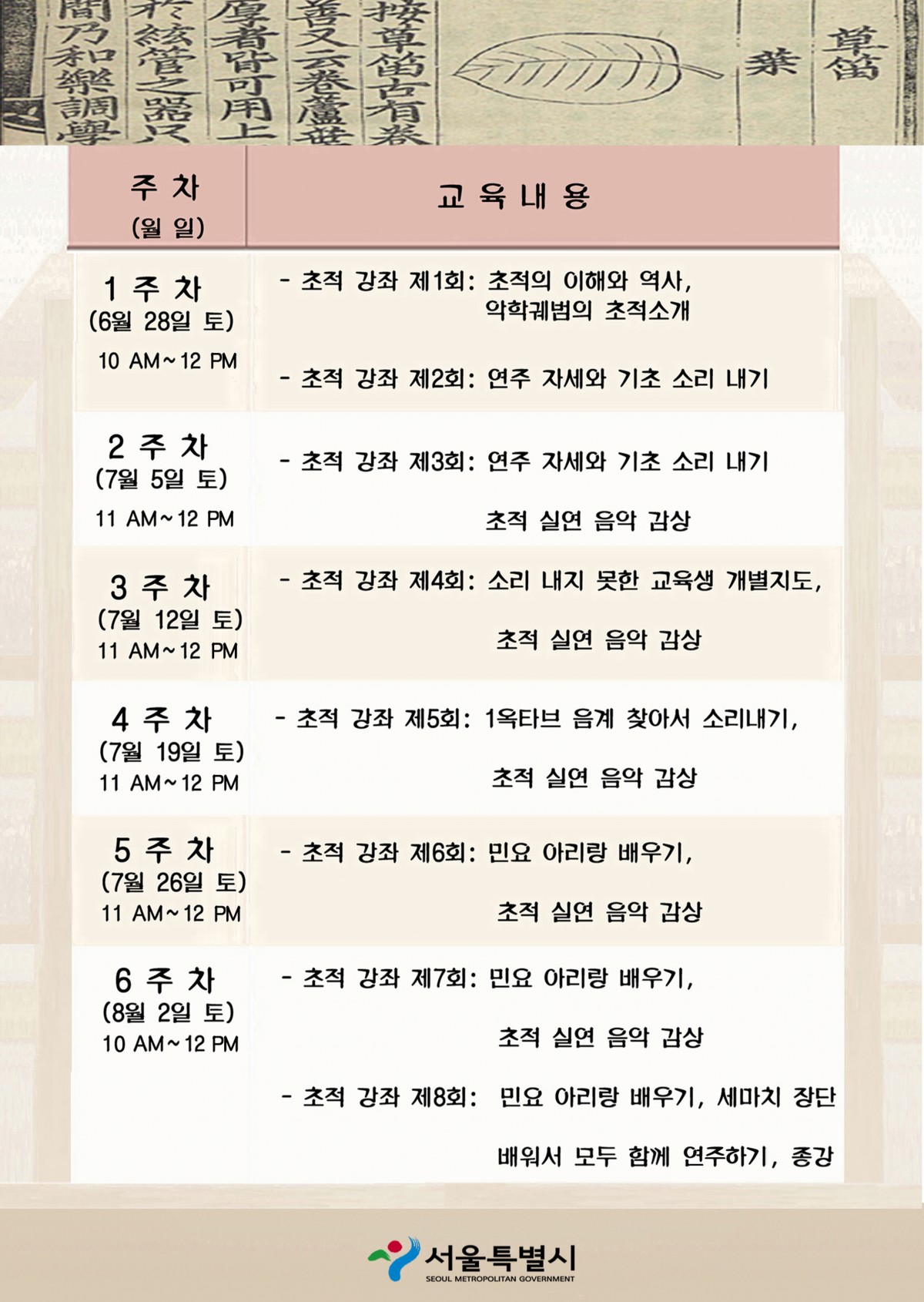 오는 6월 28일부터 8월 2일까지 매주 토요일마다 초적 교육 프로그램이 진행됩니다.