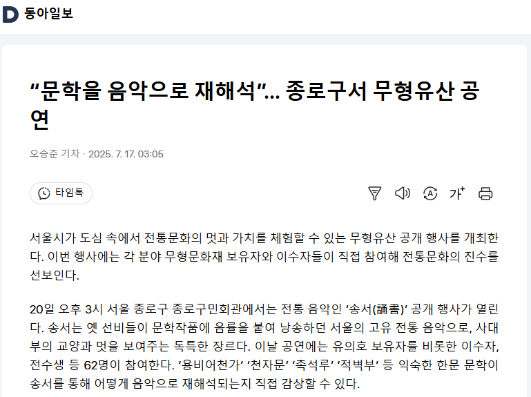 [동아일보] “문학을 음악으로 재해석”… 종로구서 무형유산 공연 페이지 정보 작성자 서울무형유산교육전시장 작성일25-07-17 18:17 조회1,608회 댓글0건 관련링크 이전글 다음글 목록 본문 ※ 자세한 내용은 아래 링크를 통해 확인 바랍니다.기사보러가기 : https://v.daum.net/v/20250717030540813 댓글목록 등록된 댓글이 없습니다. 이전글 다음글 목록