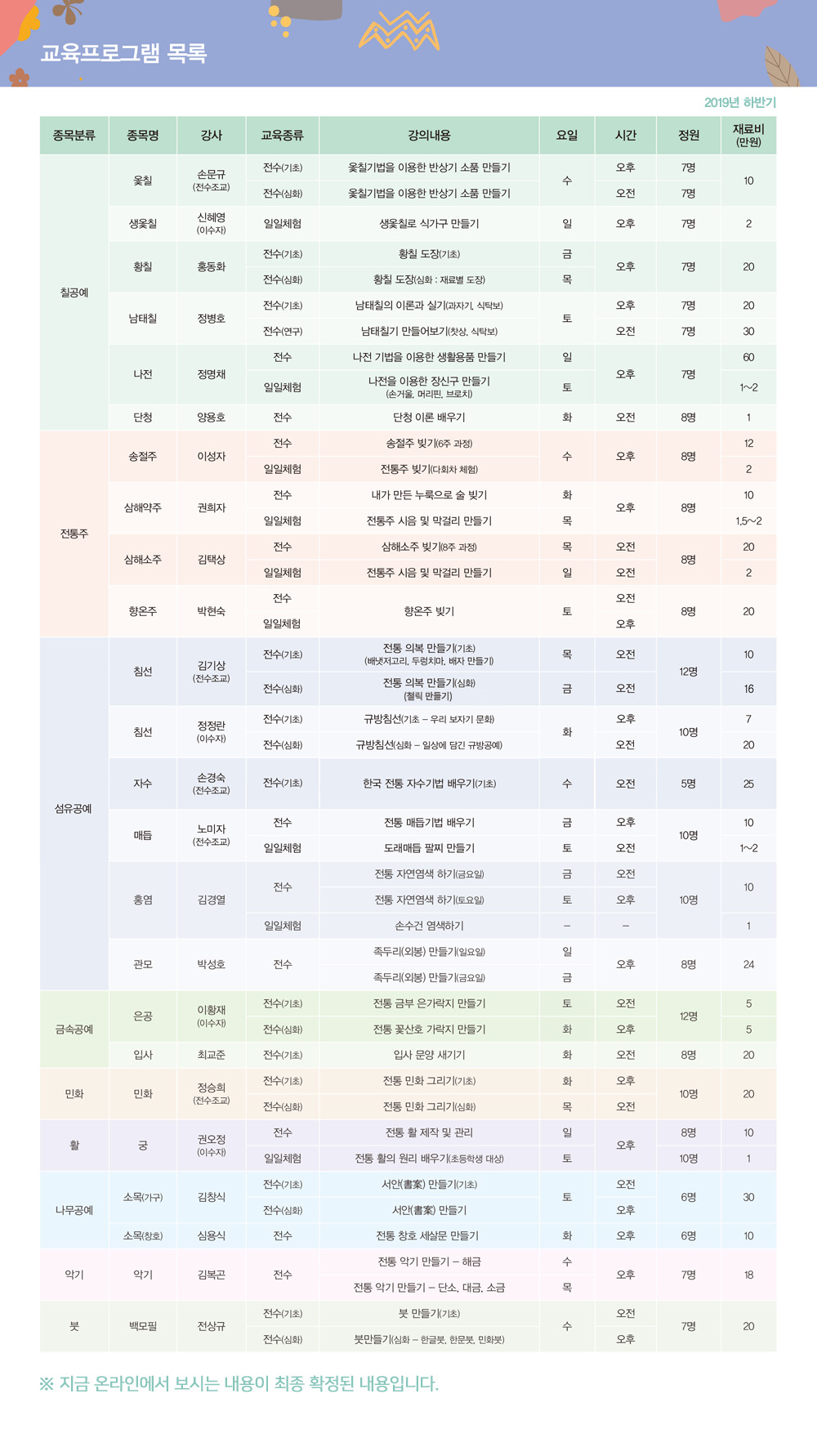 '수강신청 > 전수교육' 페이지에 순차적으로 업데이트 될 예정입니다.